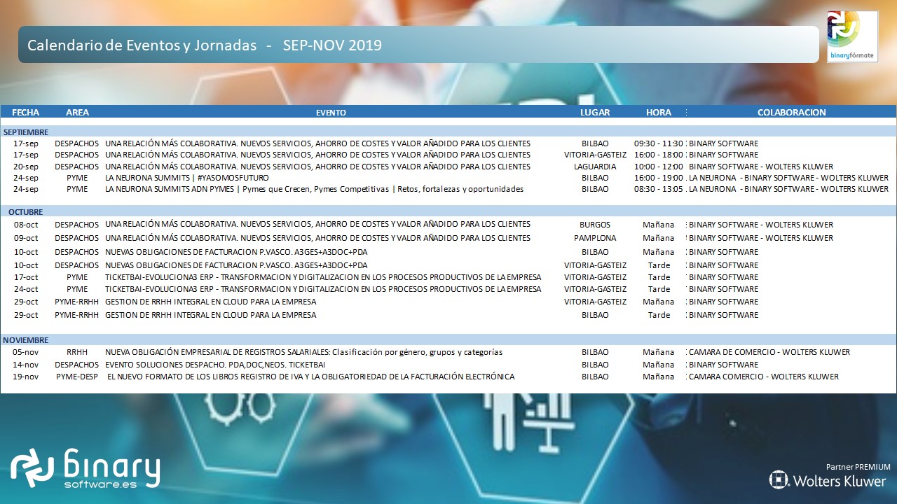 Desde Binary Software queremos ayudaros en este proceso de transformación que tenemos por delante. Queremos que conozcas nuevas soluciones para ahorrar tiempo y costes en procesos de gestión de tu negocio, como la contabilización más automatizada, la gestión de las notificaciones que emiten los organismos públicos, los indicadores de cómo evoluciona tu negocio o la gestión de la documentación de la empresa, entre otros. Soluciones, que pueden integrarse de forma sencilla en tu empresa y que pueden aportarnos mucha luz sobre la situación de los negocios, en un mundo que evoluciona a un ritmo trepidante y en continuo cambio.
